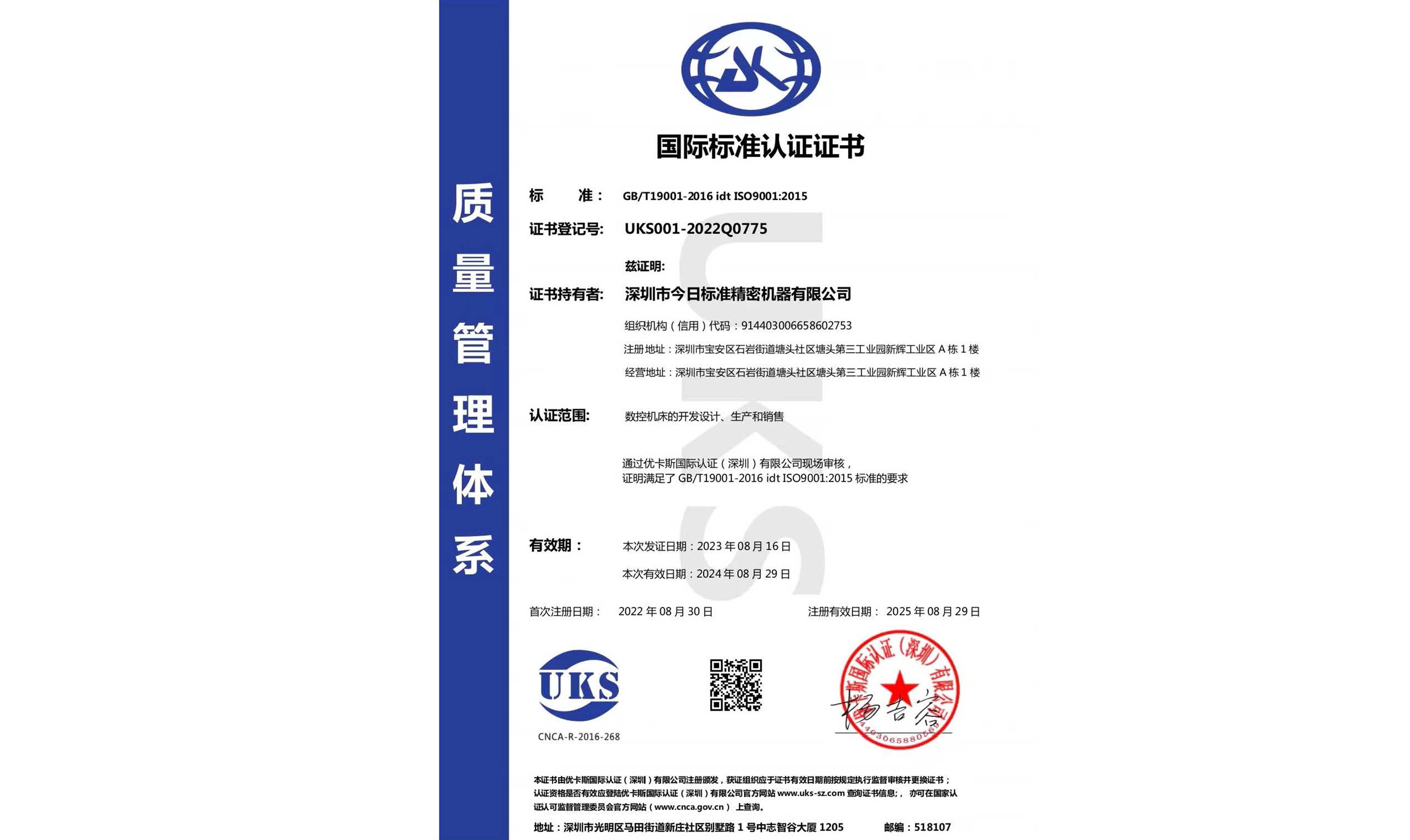 質量管理體系國際標準認證證書