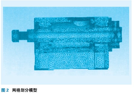 將模型導(dǎo)人有限元分析軟件ANSYS Workbench 12中,對(duì)主軸系統(tǒng)模型進(jìn)行四面體網(wǎng)格劃分,網(wǎng)格劃分后得到1807105個(gè)節(jié)點(diǎn),1184866個(gè)單元,網(wǎng)格劃分模型如圖2所示。