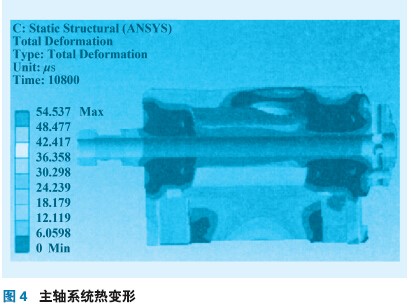 在有限元分析軟件ANSYS Workbench12中利用直接耦合順序耦合解方法,將得到的溫度場(chǎng)的溫度分布作為熱載荷加載到模型上,同時(shí)約束床頭箱體底部與床身接觸面的所有自由度,計(jì)算得到主軸系統(tǒng)的熱變形如圖4所示。