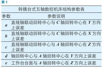 如圖1 所示為轉擺臺式五軸數(shù)控機床結構示意圖。直線軸X、Y、Z 聯(lián)動回轉中心矢量位置由加工中心數(shù)控系統(tǒng)按照加工中心結構參數(shù)進行插補計算得到。當A 軸回轉中心、C 軸回轉中心、直線軸X、Y、Z 聯(lián)動回轉中心不重合幾何誤差偏大時,五軸數(shù)控機床加工精度就會降低。因此,做到三中心重合或偏差最小,成為了提高五軸機床聯(lián)動精度的必要手段。