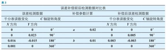(5)X、Y、C 軸做大圓聯(lián)動,觀測并記錄X、Y 兩個方向隨著C 軸角度變化時,千分表讀數(shù)變化;